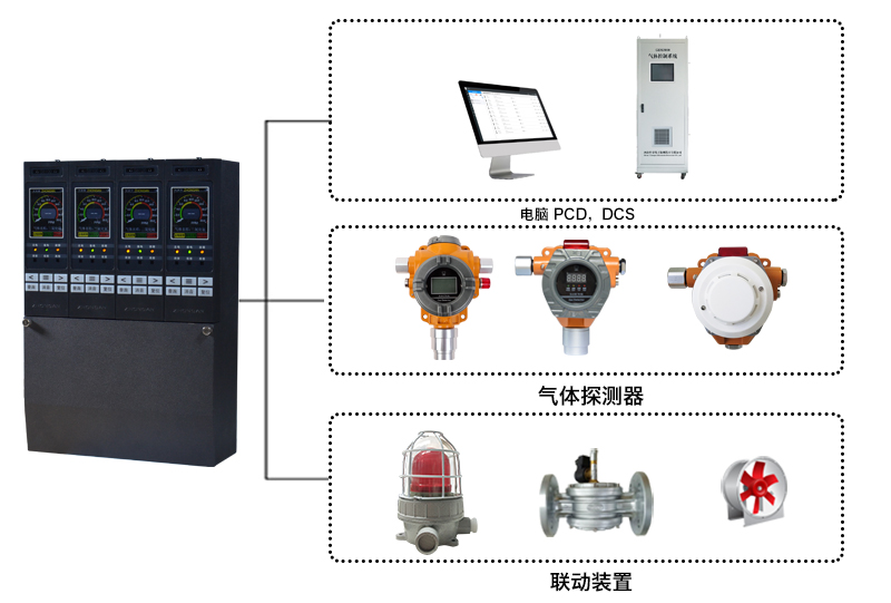 ◆ 可带多个检测不同气体成分的探测器,并同时对多点集中控制